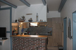 Der Wohnessraum + integrieter Küche wird durch einen Esstresen getrennt .